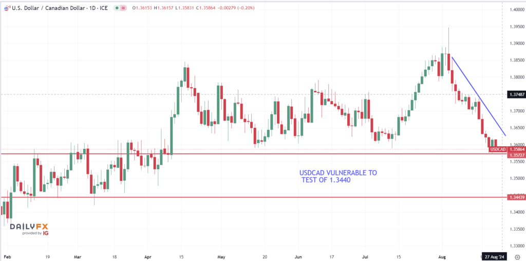 USDCAD is choppy in a downtrend channel with prices pressures exacerbated as stale long USDCAD positions are being unwound. Dovish comments from Fed Chair Powell today that suggest a need for more aggressive rate cuts would drive prices through support and put 1.3460 in play.