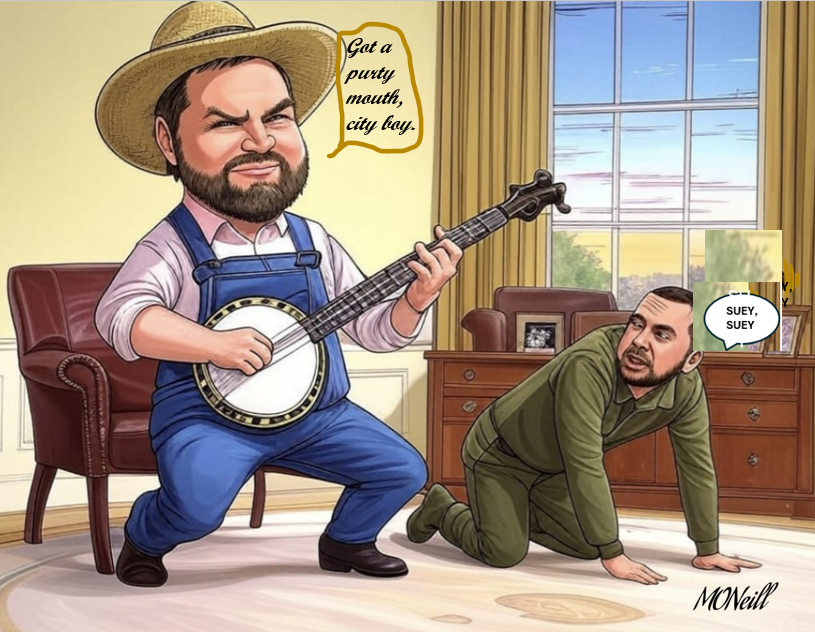 Billionaires and Hillbillies don’t usually mix in the same diplomatic circles, but when they do, it is a clown-show car-wreck catastrophe. Ukraine President Volodymyr Zelenskyy met in the Oval Office to discuss receiving a U.S. military security guarantee in exchange for 50% of Ukraine’s mineral rights. President Trump agreed to taking 50% but only as payment for previous services rendered. The hillbilly Vice President then snarled that Zelenskyy had not said “Thank you” to the United States, which is a blatant lie. The meeting deteriorated from there, and either Zelenskyy got up and left or Trump kicked him out. There is no proof that Trump’s next move was to take a call from Putin and ask him what he should do next.