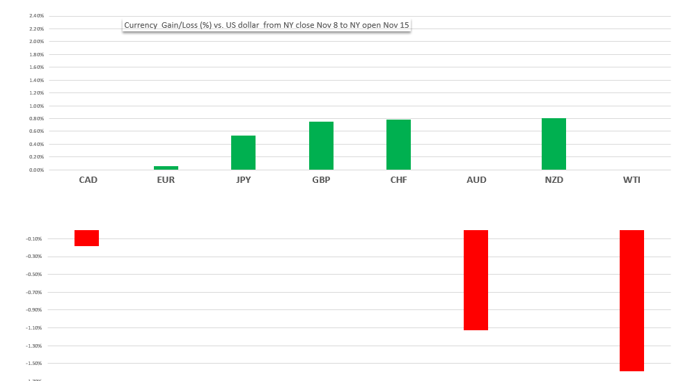 Change in currency value against the US dollar from NY close Nov 8 to NY open Nov 15