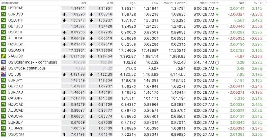 FX open, high, low, previous close as of 6:00 am ET