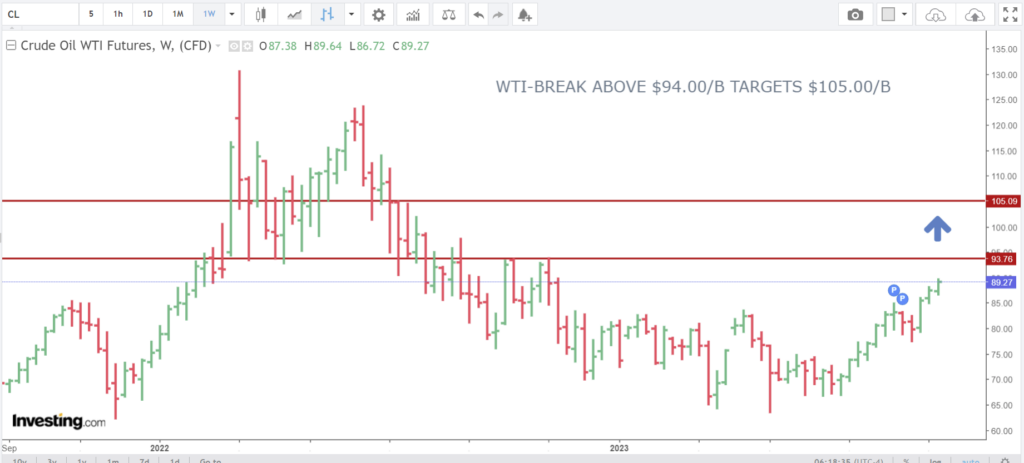 WTI extended its recent rally after the monthly Opec oil report predicted demand would outstrip supply by 3 million barrels per day. WTI has risen nearly 34% since June, and a break above resistance at $94.00 per barrel targets $105.00.