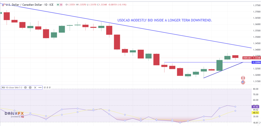 USDCAD is being bounced around by shifting US interest rate sentiment. The FOMC minutes warned that US rates may remain restrictive for longer than expected, which spurred widespread US dollar demand. In addition, steady CAD/US 10-year yield spreads continue to favour USDCAD. USDCAD drifted higher and is currently trading at 1.3355, following today’s US ADP and jobless claims reports.