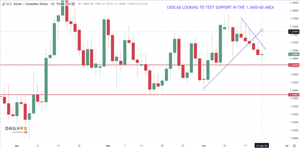 USDCAD received a bit of support after both the Industrial Product Prices Index and Raw Materials Price index were weaker than expected a sign that inflation is still cooling. Retail Sales (ex-autos) rose 1.8%, but the bulk of the gains were because of hire fuel costs. The data provides a bit more support for those hoping that the BoC cuts rates again, at its July 24 meeting.