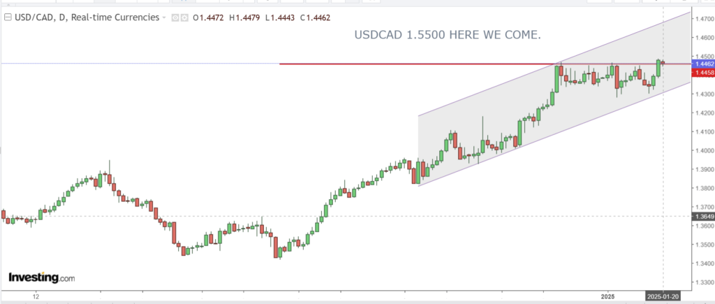 Nevertheless, the unsettled Canadian political situation complete with rising debt levels and a slumping economy suggests USDCAD is a buy  while trading above 1.4280.USDCAD is the condemned man. It is shuffling toward the gallows, and President Trump is the hangman. Mr. Trump told a crowd at a rally on Saturday night that he would sign a slew of executive orders on Day 1, with media reports claiming the number will be 100. One of those 100 orders will include the immediate imposition of a 25% tariff on all imports from Canada.