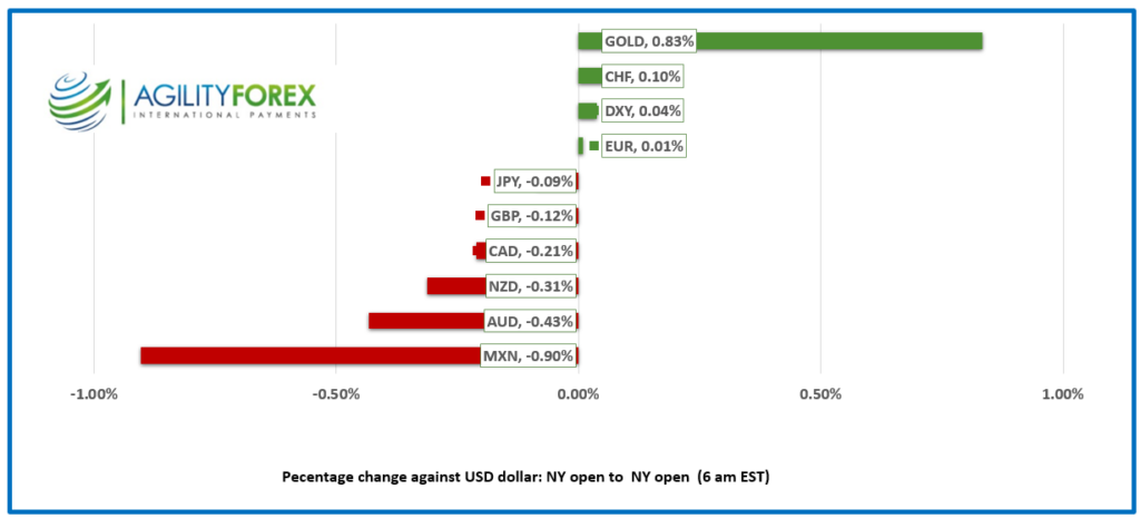 - US dollar opens mostly higher with commodity bloc underperforming.