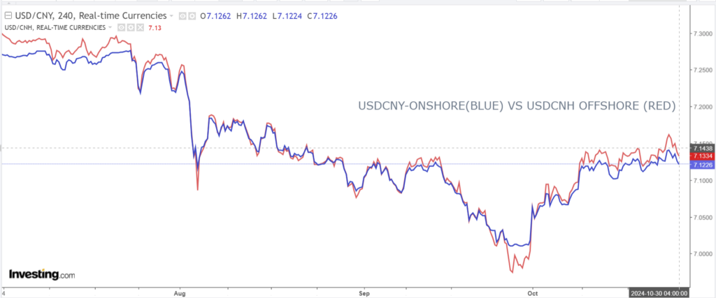 AUDUSD is near the top of its 0.6537-0.6586 range following lower-than-expected inflation (actual 0.2% q/q, forecast 0.3%, previous 1.0%). The results could prompt the RBA to trim rates ahead of schedule. NZDUSD traded firmer in a 0.5950-0.6002 range with gains capped by expectations that the RBNZ will cut rates by 50 bps in November. Some analysts are suggesting that a 75 bp cut is in the cards.