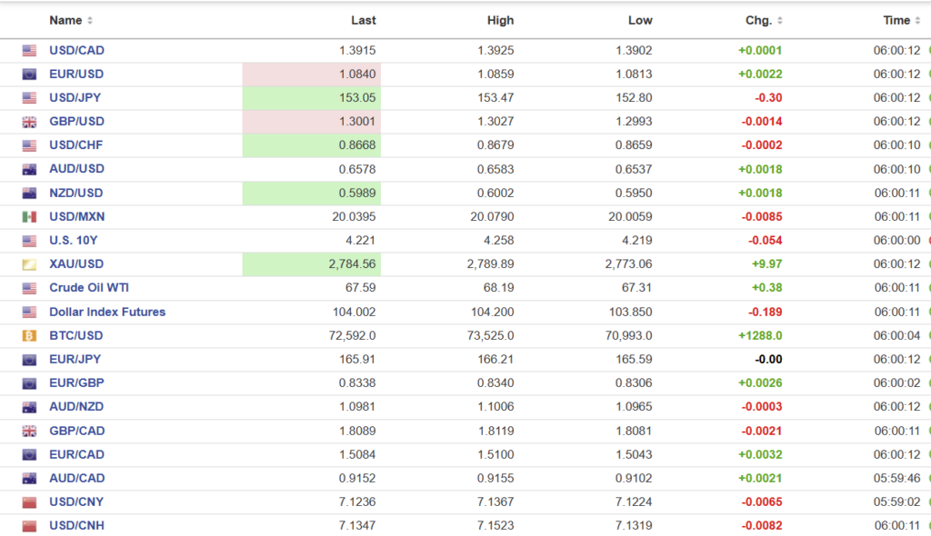 Bitcoin is in rally mode, rising from 70,993 to 73,525, just a few hundred bucks below its all-time high of 73,737.94 last March. Donald Trump, take a bow. Mr. Trump is promising a supportive cryptocurrency regulatory regime, which is helping to fuel gains.FX high, low, open (as of 6:00 am ET)