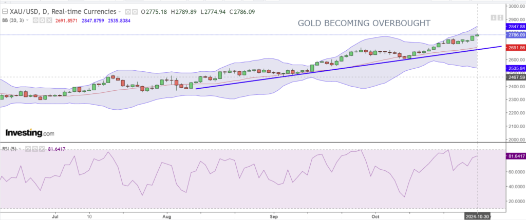 Gold traders are enjoying the confluence of events that have boosted XAUUSD from 2380.00 on August 9 to 2790.00 overnight, a 17.2% gain. It was a perfect storm of events that fueled the rally, including the outlook for lower Fed interest rates, geopolitical tensions in the Middle East and South China Sea, and uncertainty around the US election. Prices are in uncharted territory but are approaching extreme overbought territory