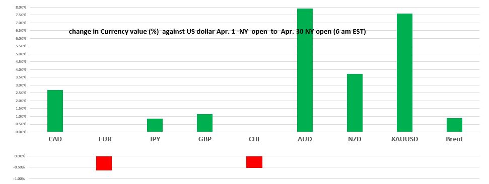 April is almost over, and it has been a good month for Wall Street bulls. The S&P 500 index is up 18% from its April 1 low. The same cannot be said for most US dollar bulls. The Australian dollar soared 7.9% since opening in New York on April 1. The NZD, CAD, JPY, and GDP gains were far less impressive but still better than CHF and EUR which were modestly lower.