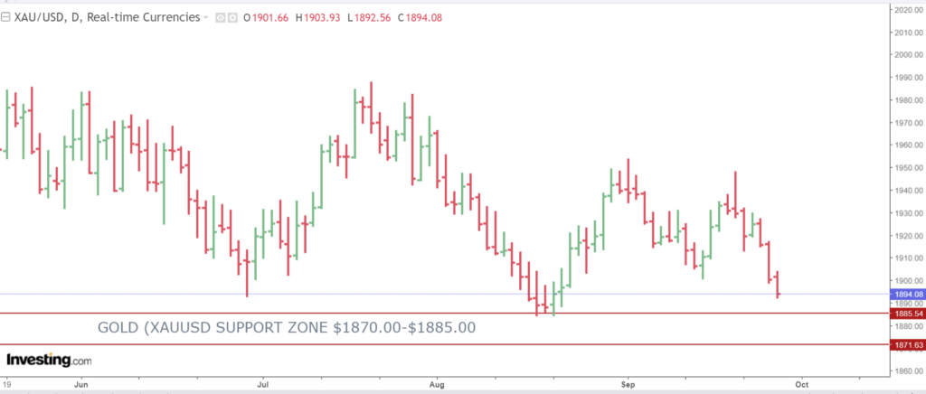 The rise in US Treasury yield has taken a toll on gold prices. Gold (XAUUSD) dropped through support at 1,190.00 and is targeting support in the $1870.00-$1885.00 area.