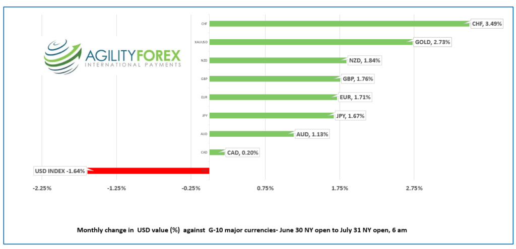 • USD ending July with sharp losses, CAD gains lag G-10