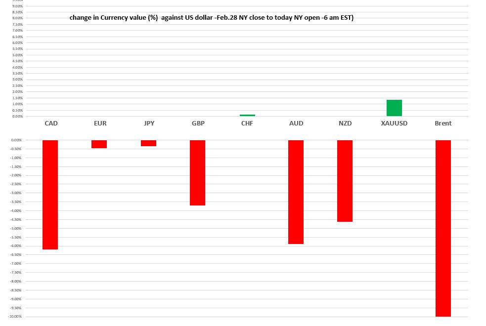 FX Recap and outlook:  March came in with a cough and would be going out on a respirator if they were available.  US equity markets are bleeding like its 2008, West Texas Intermediate (WTI) dropped 53% since its close, February 28, and the US dollar is the safe-haven currency of choice.  The COVID-19 pandemic unleashed a flood of cash after the G-10 finance ministers agreed to coordinated stimulus plans.  Central bankers slashed their benchmark interest rates and which are at, or close to 0% in Canada, US, Australia, and the UK.