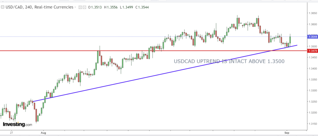 USDCAD closed out August with a loss of 1.95% which placed it in the middle of the G-10 pack, ahead of the Japanese yen and the antipodean currencies. However, it started September as the best performing currency by gaining 0.22% overnight , which quickly changed after the weak Canadian GDP data and the tame US employment report. USDCAD spiked to 1.3556 in the aftermath of the data, then dipped to 1.3535.