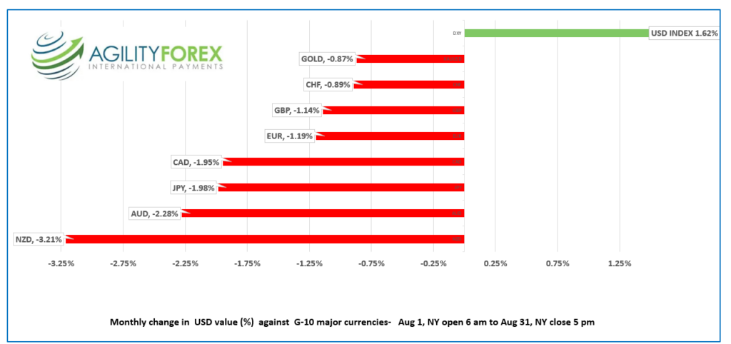 “The US dollar finished August with robust gains across the G-10 spectrum, despite giving back some of the rally in the last week of the month. The gains were mainly due to expectations that US interest rates would go higher and stay restrictive for longer than expected. NZDUSD was the biggest loser, falling 3.21%, mainly due to the Reserve Bank of New Zealand’s dovish bias.