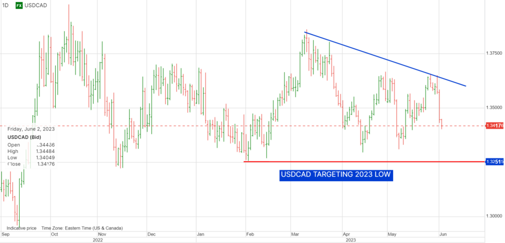 USDCAD dropped 1.3%, peak to trough since yesterday, falling from 1.3583 to 1.3409 today. The plunge was on the back of broad US dollar weakness as traders embrace the prospect that the Fed’s rate hiking cycle is over after the ISM Manufacturing report showed economic activity contracted in May for the seventh consecutive month.