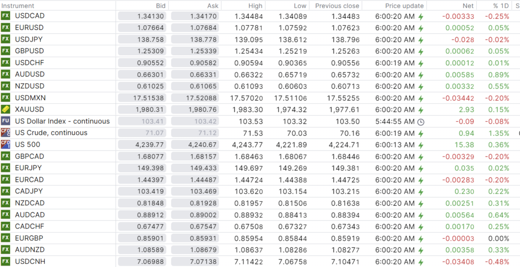 FX open, high, low, previous close as of 6:00 am ET