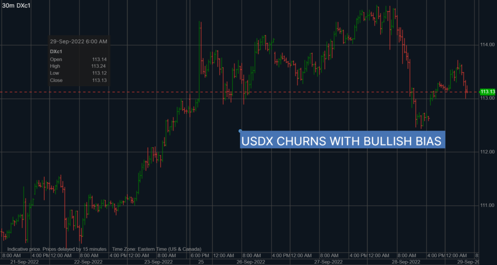 The thirty-minute, one week, US dollar index chart clearly reflects the FX volatility and indecision in markets