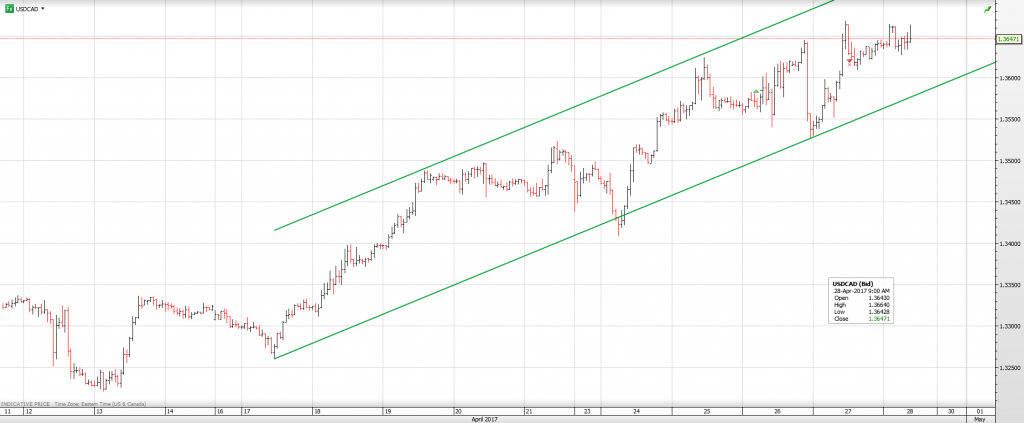 The Canadian dollar is under pressure and today’s domestic GDP data didn’t help.  It didn’t hurt either. The 0.0% growth for February (m/m) was as expected. USDCAD gains are being driven by NAFTA trade talk concerns and President Trump’s threat to bail out of it all together as well as soft commodity prices and the risk of USDCAD demand from M&A activity.