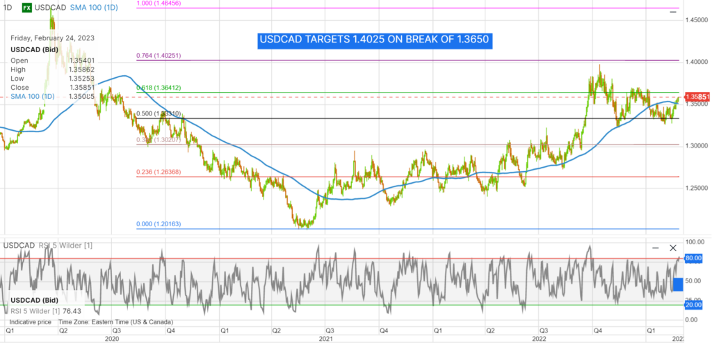 Gains continue to be fueled by hawkish Fed rhetoric in the wake of the FOMC meeting February 1, alongside the minutes from that meeting, re-affirming at least another 75 bps of rate hikes are on the agenda. Meanwhile, the Bank of Canada announced that Canadian rate hikes were being paused. The overnight US rate is 4.75% enroute to 5.50%, while the BoC overnight rate will be parked at 4.50%.