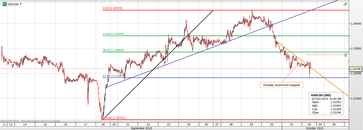 USDCAD technicals are bullish following this morning’s dip to the 61.8% Fibonacci retracement level of the September range, and subsequent bounce. The intraday downtrend was snapped on the move back above 1.3220 which suggests further gains to 1.3280. If you ignore the spike low from the June FOMC spike lower, the USDCAD uptrend remains intact while trading above 1.3150.  For today, USDCAD support is at 1.3210 and 1.3180.  Resistance is at 1.3260 and 1.3280