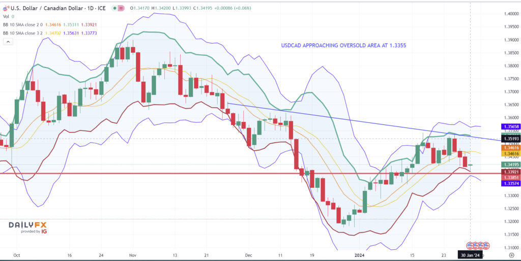 Bollinger Band studies suggest that USDCAD is becoming oversold in the 1.3350-1.3390 area which would suggest an upside correction from the lower level.