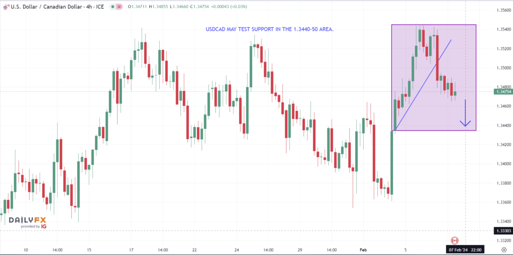 USDCAD bounced off of resistance in the 1.3540 area yesterday and snapped the intraday uptrend in the process. Sentiment flipped from bullish to bearish yesterday after the US 10-year Treasury yield slid from its 4.155% peak yesterday to close at 4.09%. Those yields climbed back to 4.132% in early NY but dropped again. That prices action is continuing to weigh on USDCAD and is driving prices to the 1.3440-60 support zone.