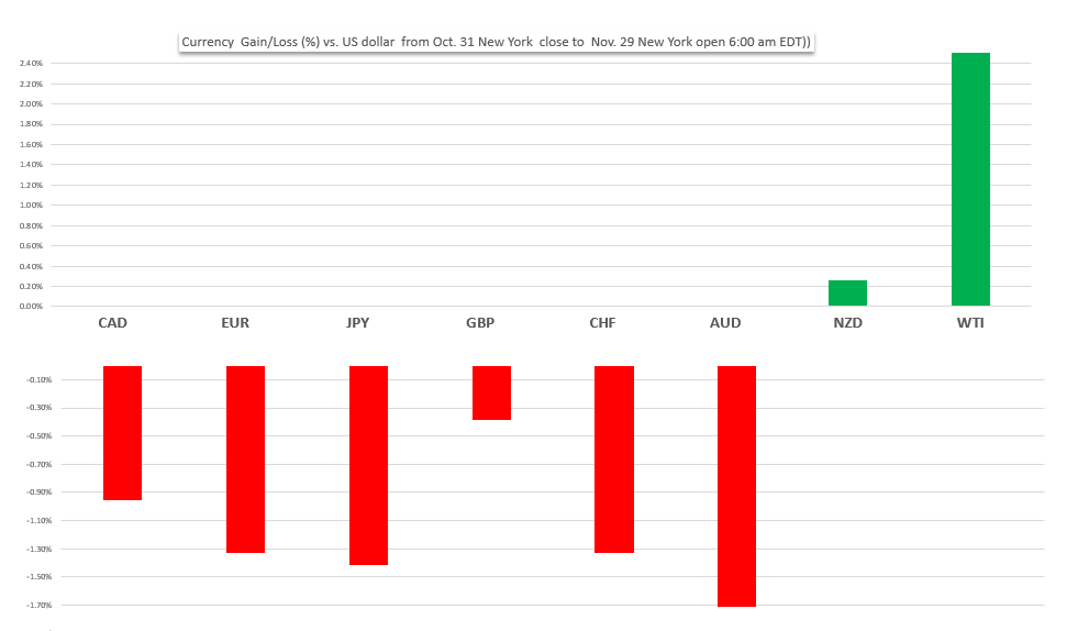 Change in currency value against the US dollar from Oct. 31 NY close to Nov. 29 NY open