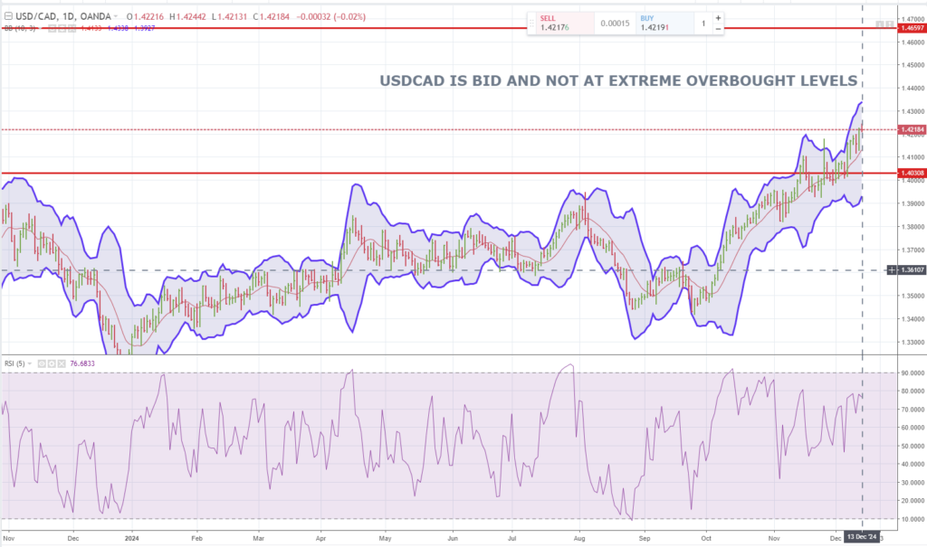 USDCAD is not at extreme over bought levels. The Bollinger band 3rd Standard deviation is at 1.4325, which should cap any gains in the short term. If it does it risks a retest of support at 1.4130