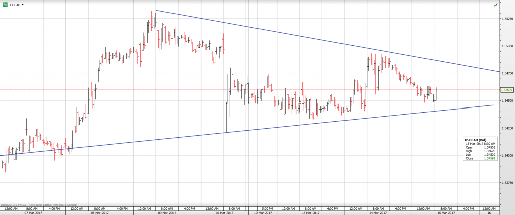 This afternoon’s FOMC meeting could provide fireworks. US rates are expected to rise by 0.25% which is fully priced in. However, the dot-plot forecast in the summary of Economic Projections is the wild card. Any indication that US rates could rise higher or faster than expected would spark a US dollar rally and the Canadian dollar would sink in the process.
