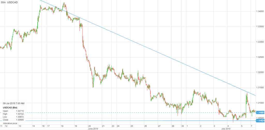 USDCAD gave back all of Friday’s post-NFP gains by the end of the day and then consolidated those losses overnight. Friday’s surge in WTI oil prices to $57.86 stopped the USDCAD rally cold. Iran caused the uptick in oil prices when it said it would increase enriched uranium production beyond the EU treaty terms.  USDCAD also suffered from the perception that the Bank of Canada policy statement on Wednesday will be neutral, which contrasts against the nearly universal expectation that the Fed will cut US rates to 2.00-2.25% on July 31.  Bearish USDCAD technicals are also weighing on the currency pair.  However, the downside may be limited as BoC Governor Stephen Poloz may be reluctant to give USDCAD bears any incentive, especially as the RBA, RBNZ and ECB are cutting rates and devaluing their currencies.