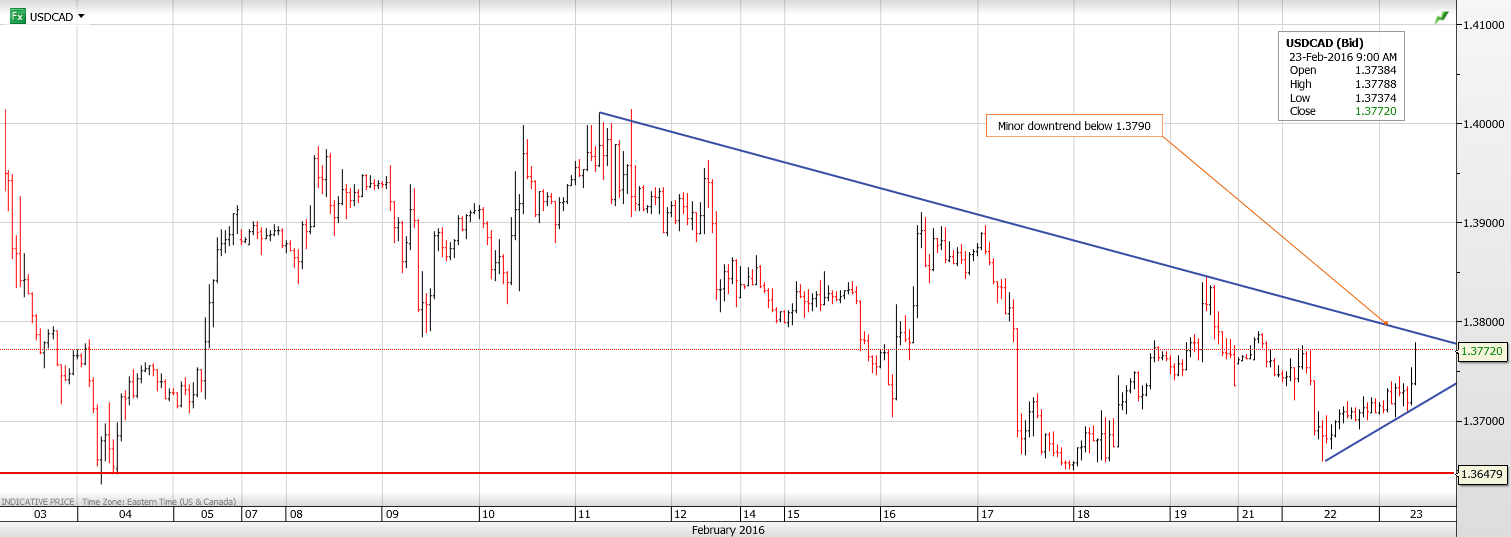 USDCAD started the daLoonie rally stalled on deficit newsy in New York with a bid tone, carried over from the Asia and European markets. That move continued into the New York session with WTI dropping to $32.80 from $33.50. The Canadian dollar also lost ground due to headlines pointing to a $30 billion Federal budget deficit in 2016/2017, a tad worse than the previous Conservative government forecast of a $4 billion surplus. In addition, there is a bit of “risk-off’ sentiment creeping into markets as evidenced by weaker equity indices and higher gold prices.
