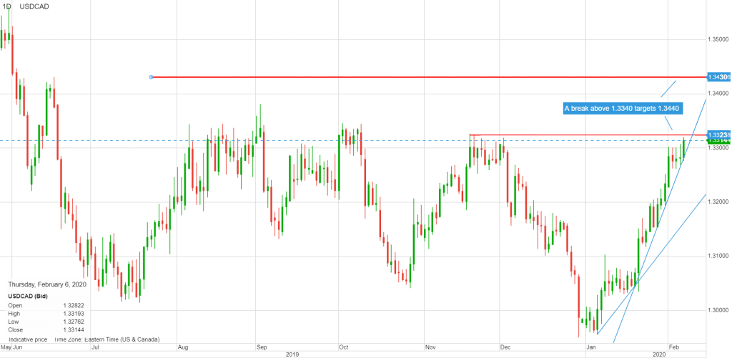 USD USDCAD was on the brink of accelerating towards 1.3400.  Resistance in the 1.3000-05 area had crumbled and prices inched above the overnight high, reaching 1.3316 prior to the release of US nonfarm payrolls and Canadian Labour Force Survey data. Canada added 34,500 jobs in January, easily beating the forecast of a 15,000 gain.    NFP rose 225,000 (forecast 205,00, the unemployment rate ticke higher to 3.6%, and average hourly earnings rose 0.2% compared to 0.1% in December.