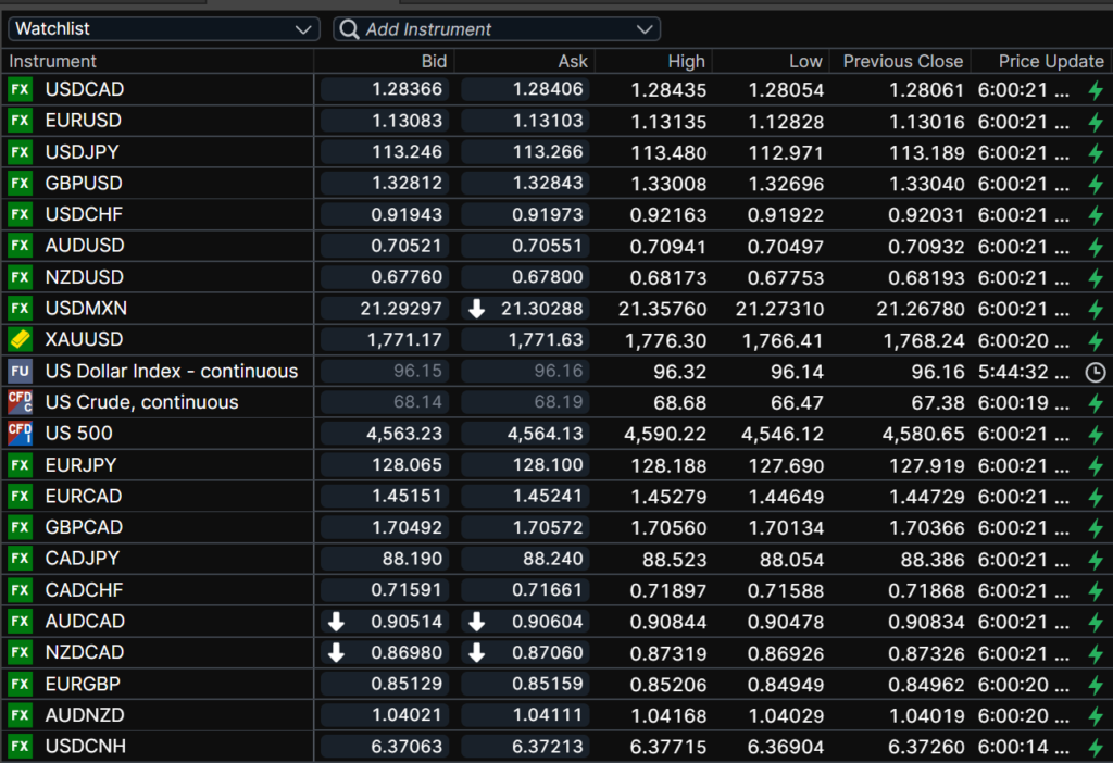 FX open, high, low, previous close as of 6:00 am ET