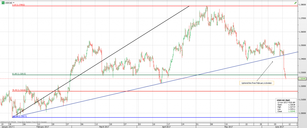 The USDCAD technical’s are bearish. The break of the uptrend line from February, combined with the move below the 100 and 200 day moving averages and the breach of 1.3280 (61.8% Fibonacci retracement of February-May range, imply further losses to 1.3162.