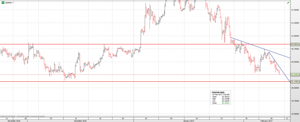 USDMXN continued to slide after the Bank of Mexico (Banixco) raised interest rates by 50 basis points to 6.25%. The move was widely expected. The Trump/Mexico wall has been pegged at a cost of $21.6 billion. The intraday USDFMXN technicals are bearish while prices are below 20.4020 and looking for further losses to 20.1190