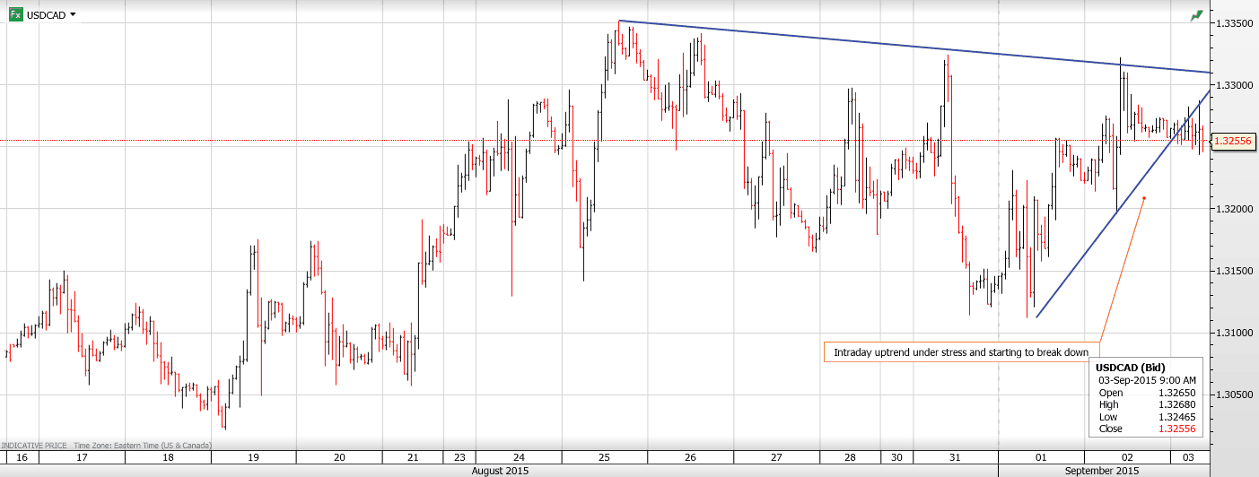 Chart: USDCAD hourly showing intraday uptrend starting to break