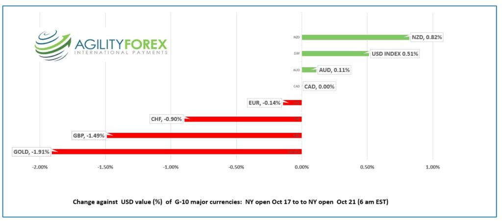 GBPUSD traded with a negative bias and dropped from 1.1236 to 1.1062 due to a mix of broad US dollar demand and political uncertainty in the UK. UK data didn’t do the currency any favours, with Retail Sales dropping 1.4% m/m in September compared to expectations for just a 0.5% decline.