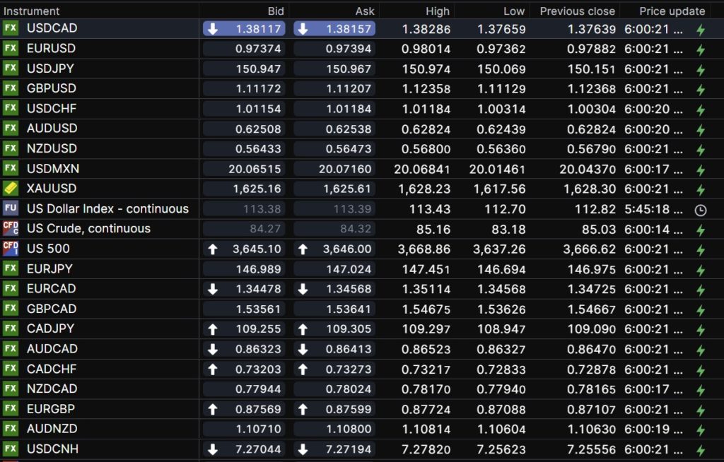 FX open, high, low, previous close as of 6:00 am ET