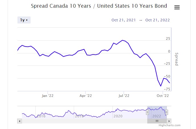 The slightly hotter-than expected Canadian inflation report which strongly suggests the Bank of Canada hikes rates 75 bps next week hasn’t filtered into the bond market. The yield on the Government of Canada 10-year bond is 59.2 bps lower than the US 10-year Treasury yield, as of 6:15 am ET. The negative spread is underpinning USDCAD.