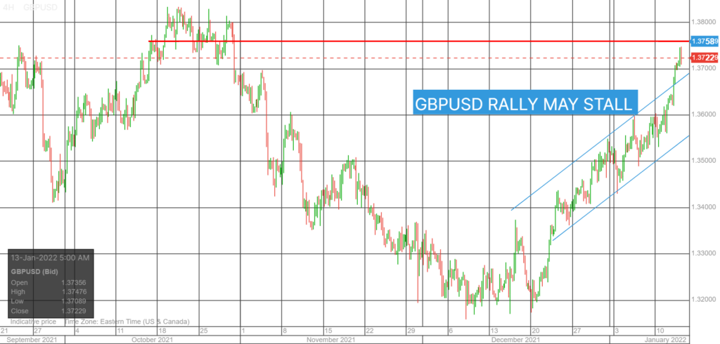 EURUSD accelerated higher after the “as expected” US inflation data yesterday and hasn’t looked back.  EURUSD climbed from 1.1323 pre-CPI to 1.1477 in Europe before easing to 1.1463 in NY.  ECB policymaker Luis de Guindos may be deviating from the script when he said that inflation might not be as transitory” as recently forecast.  The ECB economic bulletin said the global economy was recovering, but rising commodity prices, supply disruptions, and the Omicron variant weigh on the near-term growth prospects.  The EURUSD technicals are bullish above 1.1380, looking for a test of 1.1500.