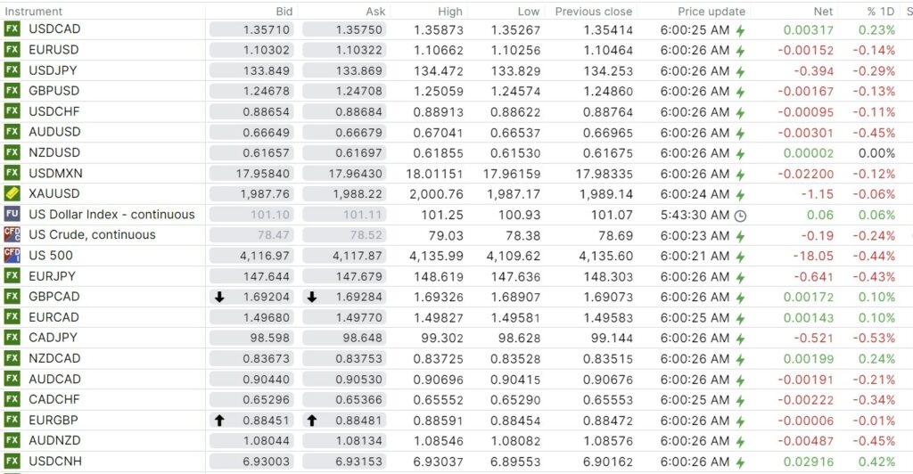FX open, high, low, previous close as of 6:00 am ET