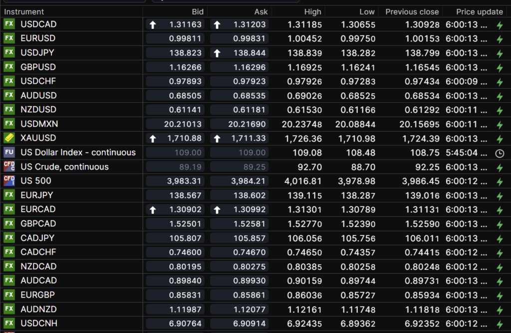 FX open, high, low, previous close as of 6:00 am ET