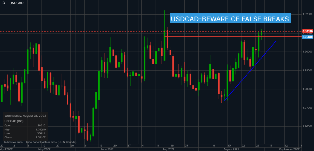 Keep in mind, that the FX market is still in summer-holiday-mode, and liquidity is poor, which exaggerates prices swings.  USDCAD needs to spend a few days above 1.3070 to confirm the upside break.