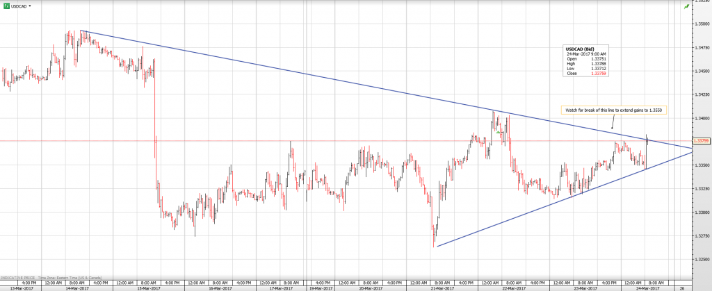 USDCAD broke higher and snapped a minor intraday downtrend after this morning data releases. US Durable Goods Orders for February came out better than expected (Actual 1.7% vs. forecast 1.2%, y/y) while Canada CPI was a tad softer. USDCAD rallied from 1.3345 to 1.3380 on the news. The rest of the FX majors merely yawned after the US data.