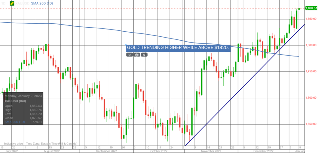 Gold (XAUUSD) bulls have embraced the “US interest rate topping” scenario. Prices have climbed steadily since bottoming at $1617.00 on November 17 and touched $1880.74/in early NY.