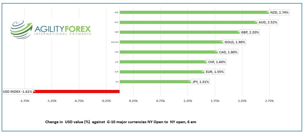 When the dust settled, the S&P 500 closed 2.28% higher, the US dollar plunged across the board, and the 10-year Treasury yield fell to 3.55% from 3.76%.