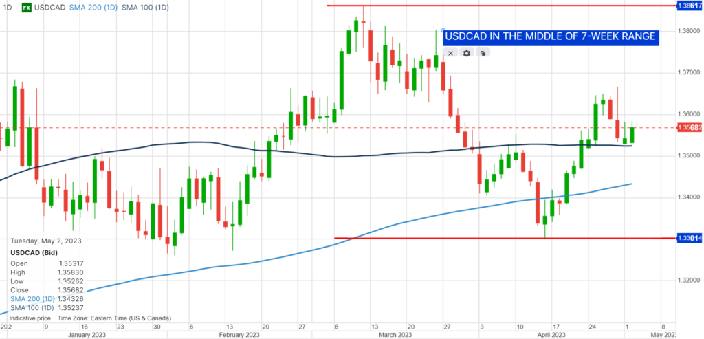 USDCAD is trading just below the middle of its 1.3300-1.3560 range that has contained price action since March 10. That won’t change today.