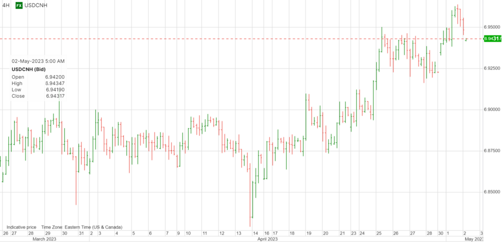 EURUSD rose steadily from yesterday’s NY close of 1.0977 to 1.1006 then plunged to 1.0949 after Eurostat released inflation data for April. The headline Harmonized Index of Consumer Prices (HICP) was hotter than expected (7.0% y/y vs forecast 6.9%), but that was ignored. Traders focused on Core HICP which was lower than forecast (actual 5.6% y/y vs forecast 5.7%).