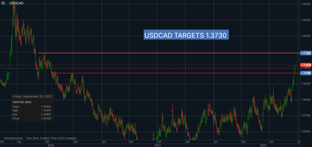 USDCAD is on a tear and has been since the hotter than expected US inflation report on September 13. Since then, prices climbed from 1.2955 to 1.3549 for a gain of 4.5% and there is more upside.