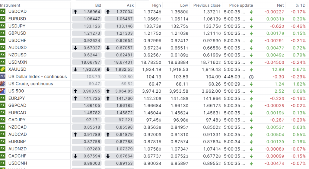 FX open, high, low, previous close as of 6:00 am ET